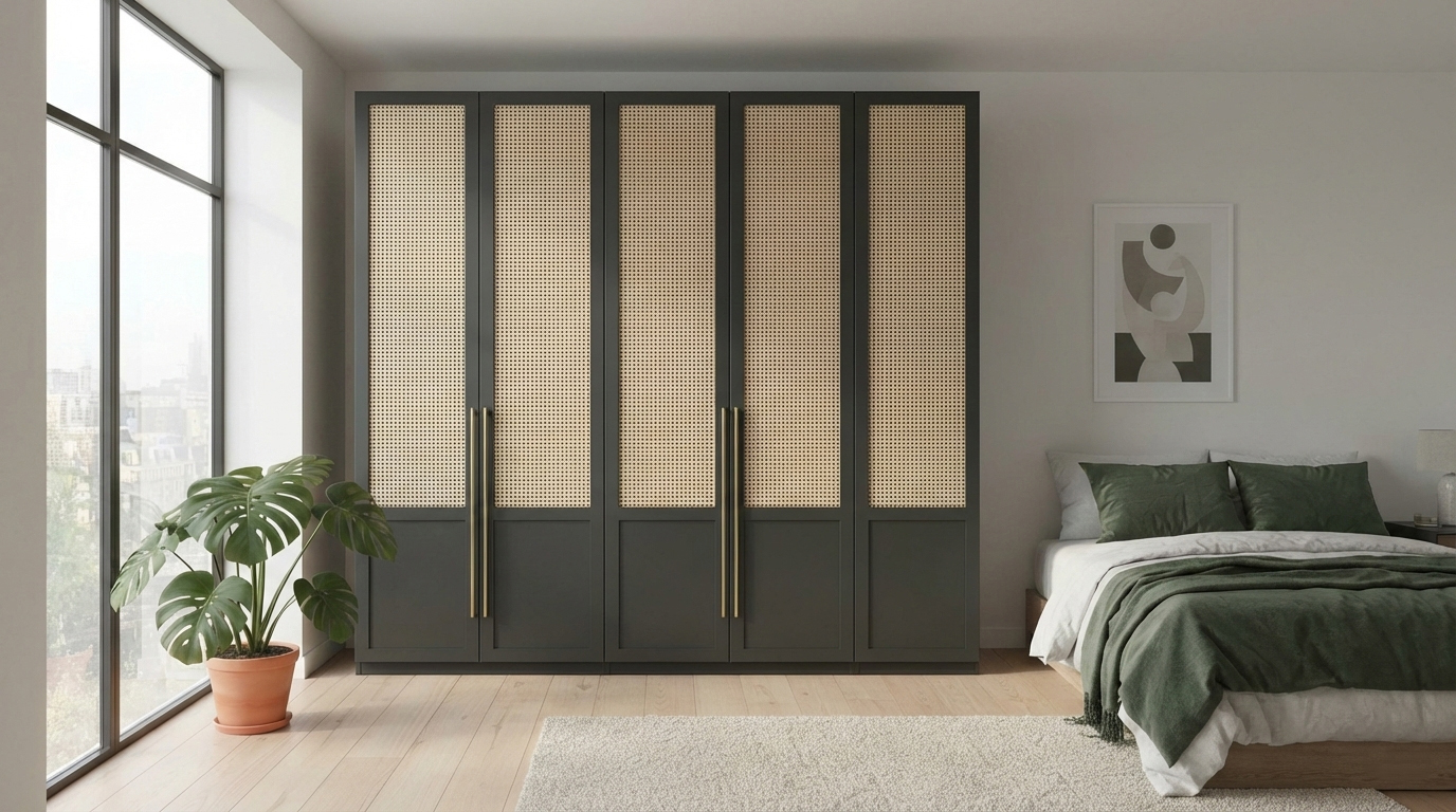 Cane or rattan finishes are making a comeback in heritage-inspired and tropical interiors. They add texture and a handcrafted feel to wardrobe shutters.